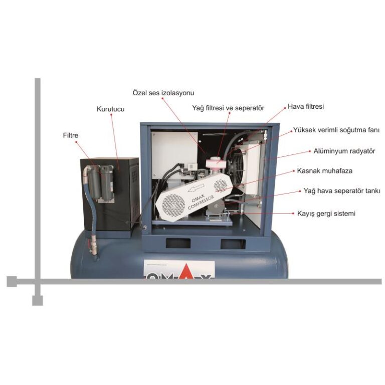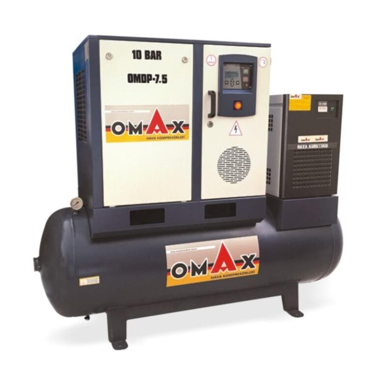 Omax Depo Üstü Vidalı Hava Kompresörleri, akuple dizaynı ile yüksek verimlilikte kullanıma uygun olarak üretilmektedir. Vidalı kompresörler, basınçlı hava üretmek için piston yerine birbirine geçmiş rator çiftinin kullanıldığı ve bu rator çiftinin dönmesiyle emilen havayı çıkışa doğru taşıyarak sıkıştıran bir kompresör tipidir. Yağ enjeksiyonlu, asimetrik helisel profili iki rator yataklıdır ve gövdeden oluşan vida en ileri teknoloji ve yüksek performans ürünüdür. Ratorların dönüşünden dolayı vida olarak adlandırılan bu grup kompresörün kalbidir. Masrafsız ve sorunsuz çalışan vidalı hava kompresörlerini; Plastik endüstrisinin ürettiği pet şişe şişirmelerinde, ağaç ve cam endüstrilerinde yapılan kaplama tekniklerinde, güç tesisleri için gereken işlem havası temininde, maden ocaklarında metan ve diğer tehlikeli gazların tahliyesinde, nitrojen gazı endüstrisi ve daha birçok endüstride kullanılır. Ürünlerimizde bulunan özel tasarımla dizayn edilmiş kontrol panellerinden yaptığınız tüm işlemleri kolayca takip edebilirsiniz.